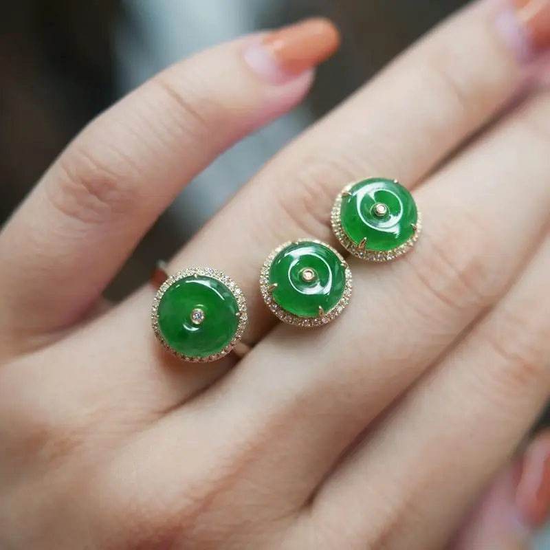 Original New Natural Ice Seed Sun Green Chalcedony Earrings Opening Adjustable Ring Retro Elegant Light Luxury Charm Jeweler